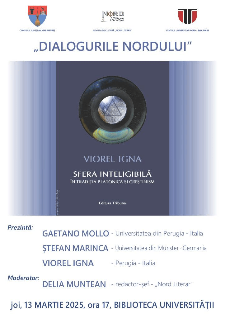 De la ora 17:00, Viorel Igna, profesor de filosofie stabilit în Italia, va susține conferința „Sfera inteligibilă în tradiția platonică și creștinism” despre cartea cu titlul omonim publicată de curând și care are la bază teza de doctorat susținută în la Școala Doctorală de Filosofie (IOSUD-UTCN) din Baia Mare, sub îndrumarea prof. emerit Petru Dunca. Alături de autor vor mai prezenta și profesorii Gaetano Mollo de la Universitatea din Perugia, Italia, și Ștefan Marinca de la Universitatea din Münster, Germania. Moderatoarea evenimentului va fi dr. Delia Muntean, redactor-șef al Revistei de Cultură „Nord Literar” și profesoară la Colegiul Național „Vasile Lucaciu” din Baia Mare. Evenimentul are loc în cadrul conferințelor „Dialogurile Nordului”, organizate de revista de cultură Nord Literar în parteneriat cu Centrul Universitar Nord din Baia Mare.