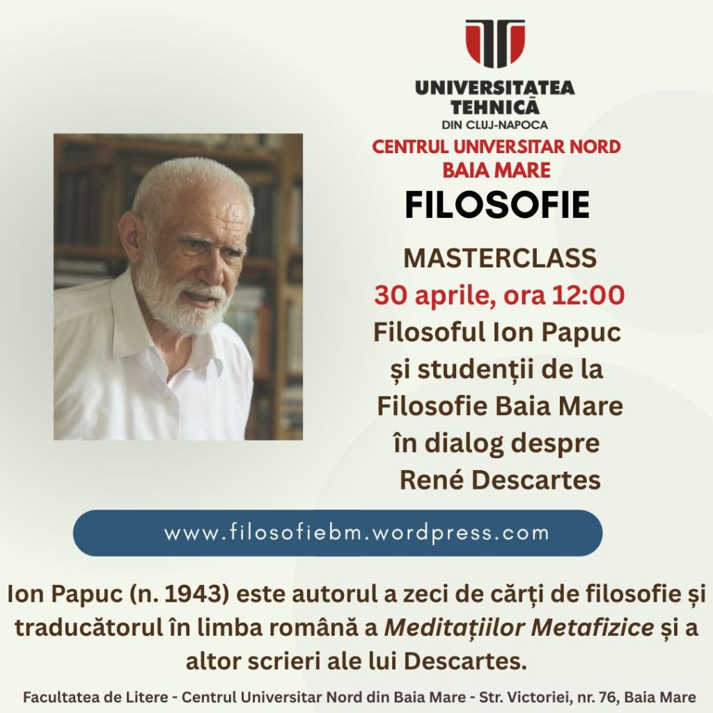 Pe 30 aprilie, studenții de la Filosofie Baia Mare (nivel licență) vor participa la un masterclass despre filosofia lui Rene Descrartes împreună cu traducătorul în limba română a Meditațiilor Metafizice, filosoful Ion Papuc.