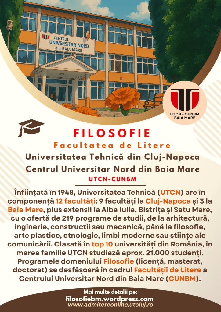 În anul 2012, Universitatea Tehnică și Universitatea de Nord au fuzionat, astfel că Filosofia, alături de celelalte catedre ale Facultății de Litere din Baia Mare, a devenit și ea parte a marii familii UTCN. Suntem mândri că Filosofia face parte din cadrul Universității Tehnice (UTCN), una dintre cele mai mari și bine cotate universități din România (top 10), o instituție înființată în 1948, care promovează inovația tehnică și cercetarea umanistă, asemenea marilor universități americane. UTCN are în structura sa 12 facultăți grupate în două centre universitare: 9 la Cluj-Napoca și 3 la Baia Mare – cele mai mari și dinamice orașe din nord-vestul țării – plus extensii la Alba Iulia, Bistrița, Zalău și Satu Mare. Cele două centre își desfășoară activitatea într-o strânsă legătură academică și instituțională, oferind un total de 219 programe de studii de licență și masterat atât în domeniile tehnice (arhitectură, construcții, informatică, inginerie, și multe altele) cât și în domeniile umaniste (filosofie, jurnalism, științe ale educației, arte plastice, limbi moderne aplicate, etc). În cele două centre universitare ale Universității Tehnice sunt înmatriculați aproximativ 21.000 de studenti și 925 cadre didactice. De asemenea, UTCN întreține peste 400 de acorduri interuniversitare și internaționale, multiple parteneriate Erasmus+ și una dintre cele 9 instituții membre a prestigioasei European University of Technology (EUt+). Programele specializării Filosofie se desfășoară în cadrul Facultății de Litere a Centrului Universitar Nord din Baia Mare (CUNBM).