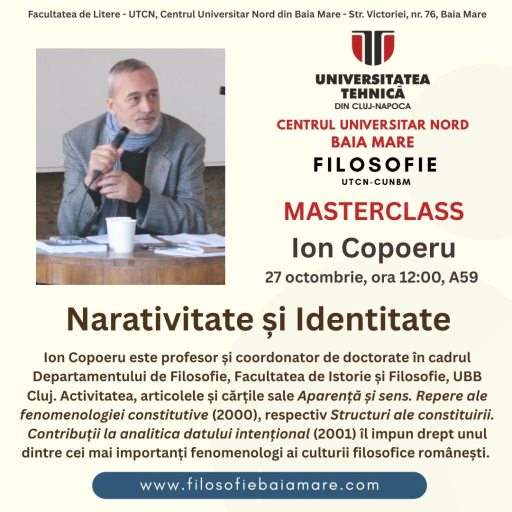 Studenții, masteranzii și doctoranzii de la Filosofie UTCN Baia Mare au fost invitați să participe la Masterclass-ul oferit de Prof. univ. dr. habil Ion Copoeru cu tema „Narativitate și Identitate”. Masterclass-ul a avut loc luni, 27 octombrie 2025, ora 12:00, în sala A59 din sediul de pe Str. Victoriei, nr. 76 a Centrului Universitar Nord din Baia Mare.