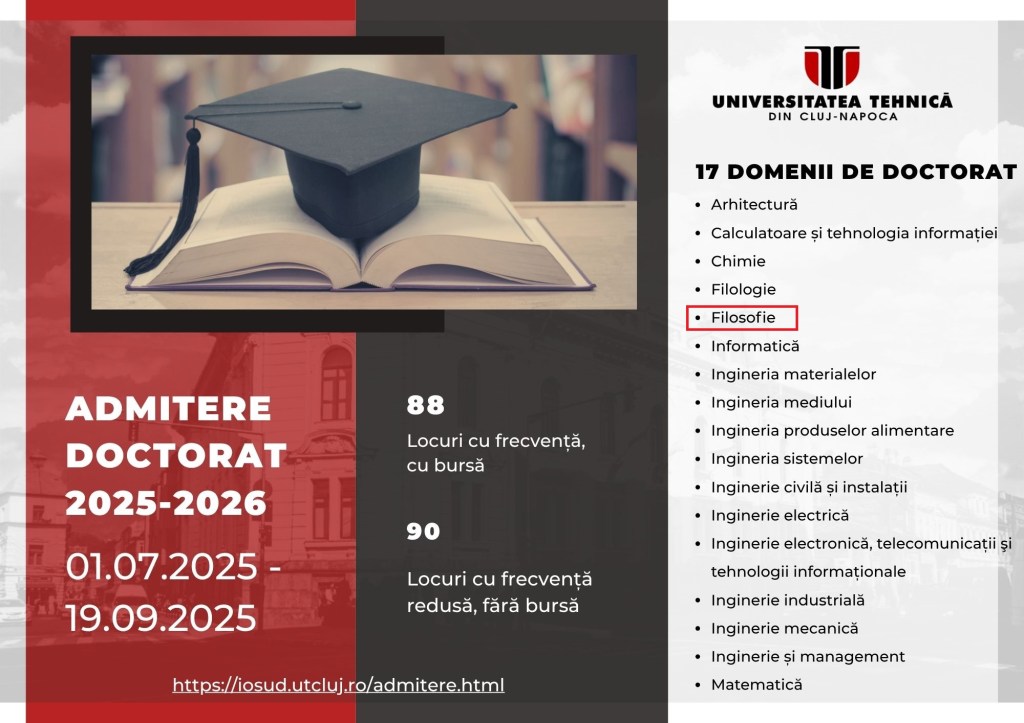🎓Pentru admiterea la programul DOCTORAT ÎN FILOSOFIE oferit de Școala Doctorală de Filosofie a Universității Tehnice din Cluj-Napoca (IOSUD-UTCN) vă rugăm consultați paginile http://litere.cunbm.utcluj.ro/doctorat/ și https://iosud.utcluj.ro/admitere.html
