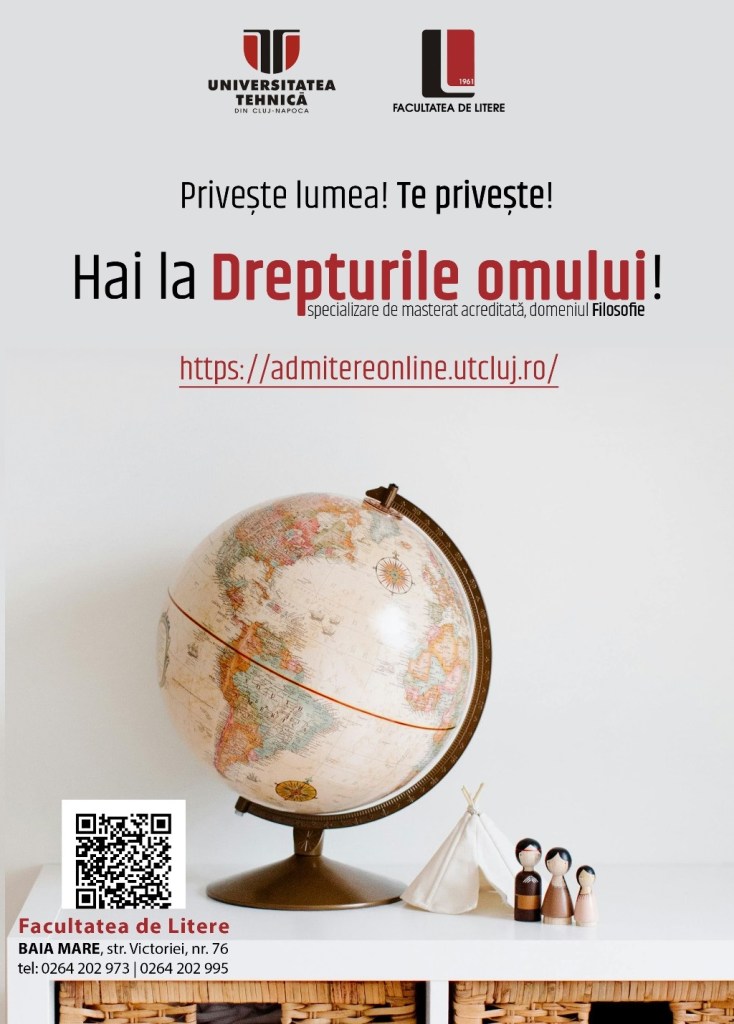 🦉 Înscrierea la programul de MASTERAT ÎN DREPTURILE OMULUI (domeniul Filosofie) de la Baia Mare se face ONLINE în perioada deschisă admiterii (iulie și septembrie) de pe pagina: https://admitereonline.utcluj.ro/cunbm-facultatea-de-litere-master/